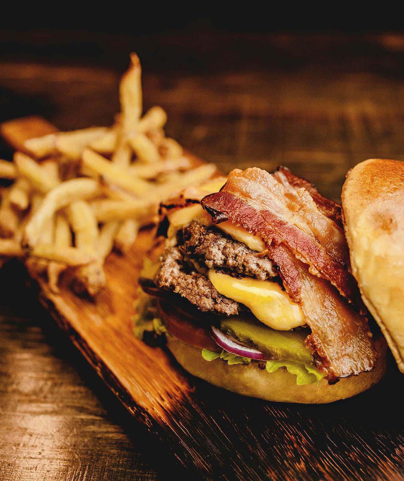 Spiegelei, Bacon, Käse, Burgerbuchtsauce, Salat, Tomaten, karamellisierte Zwiebeln